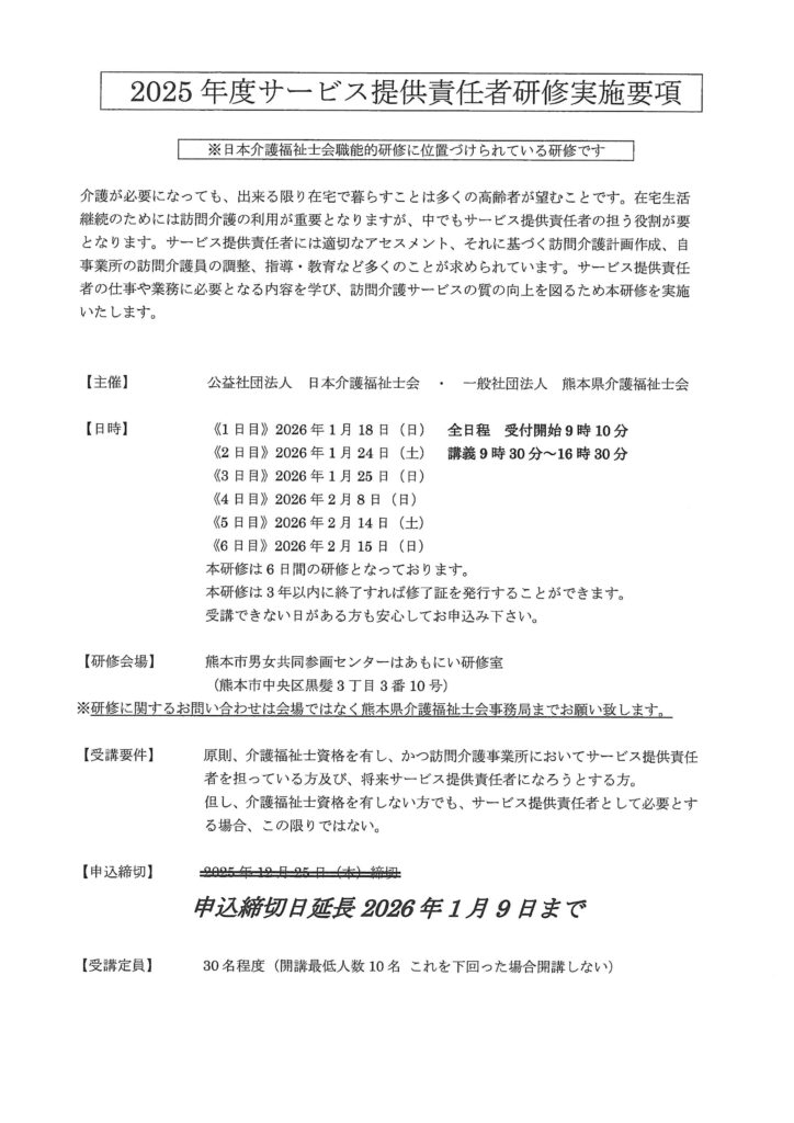 「2025サービス提供責任者研修」 申込締切日を延長しました