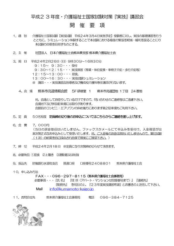 「直前勉強会希望」とお書き頂き、住所・氏名・電話番号・勤務先を明記の上、Eメール(携帯からも可)、ファックス、郵便ハガキのいずれかで熊本県介護福祉士会までお申込み下さい。その後、下記の口座にご入金下さい。