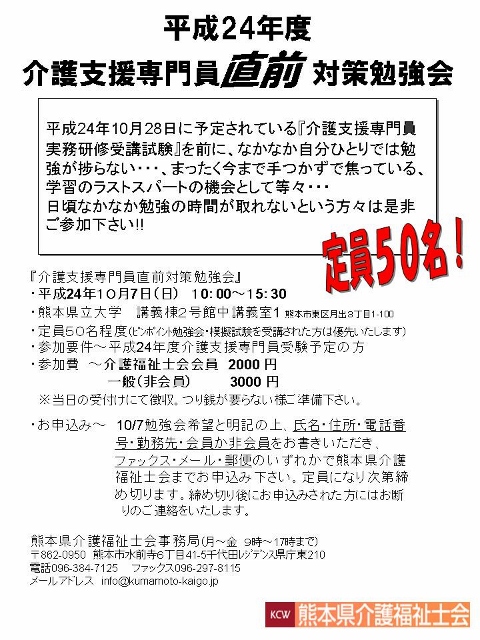 10/7 (日)10~ 介護支援専門員直前対策勉強会 熊本県立大学